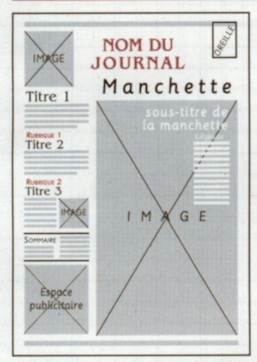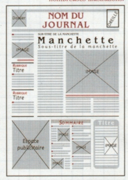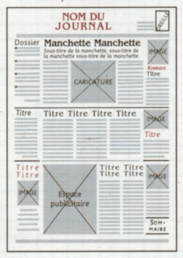 Cette maquette est construite sur 5 colonnes. La Une présente un grand nombre d'éléments différents et beaucoup de texte, nécessitant une police de petite taille. La manchette est illustrée par une caricature. |
